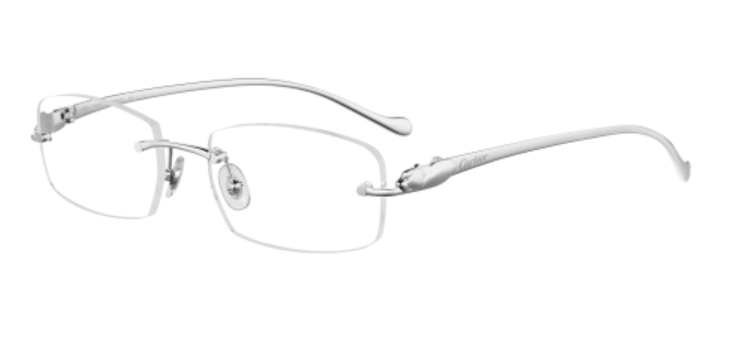 Classical rectangular rimless feminine shape, featuring the emblematic Panthère de Cartier for an audacious and glamorous design. Precious pouncing panther sculpture on a slender temple with pure and dynamic lines. Precious finishes in gold, platinum or ruthenium. Precious finishes (gold, platinum and ruthenium) adorning the décor and the bronze temples.